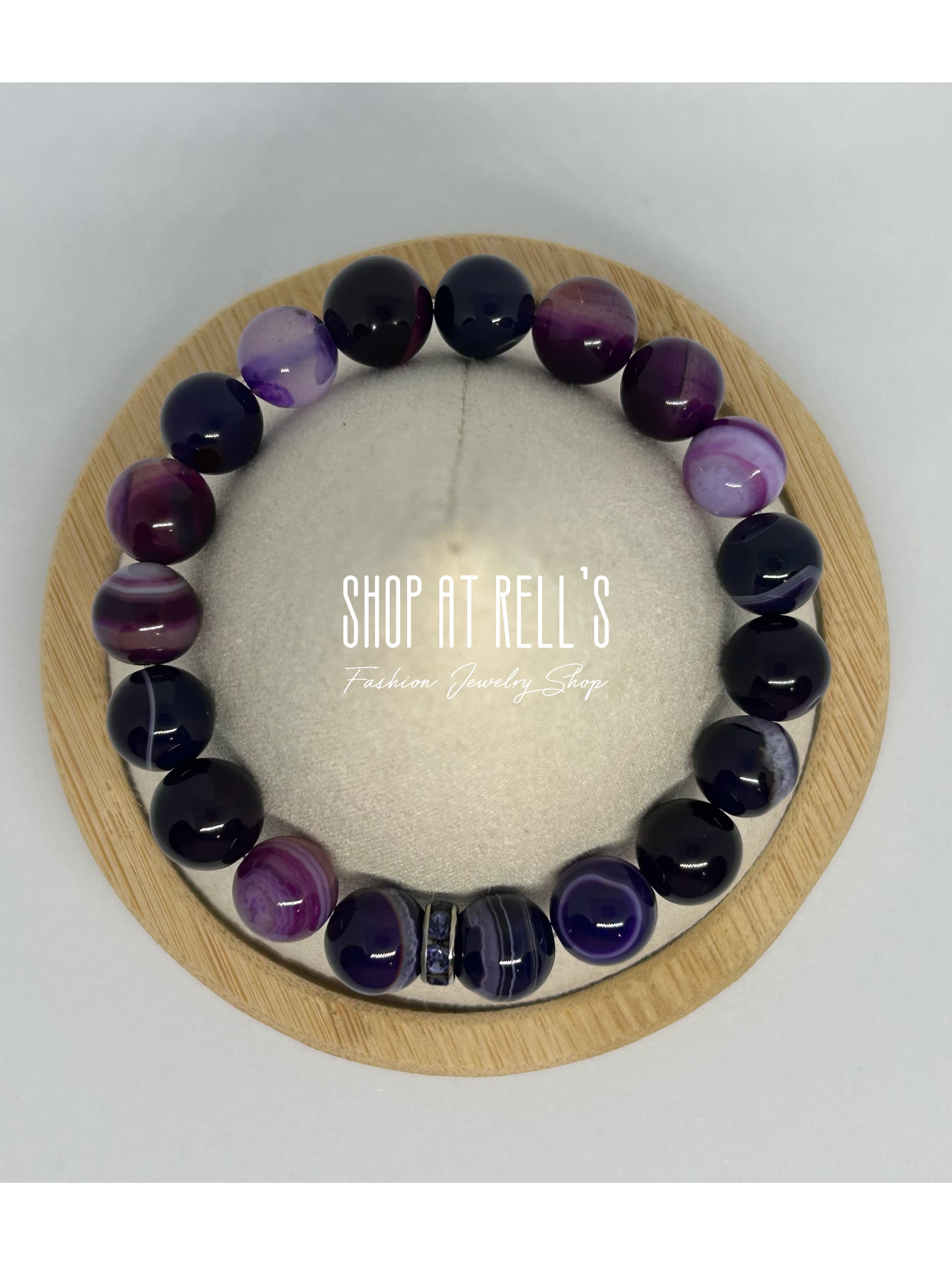 Handmade. 10mm purple striped agate stones and a purple studded bead. Stretch.