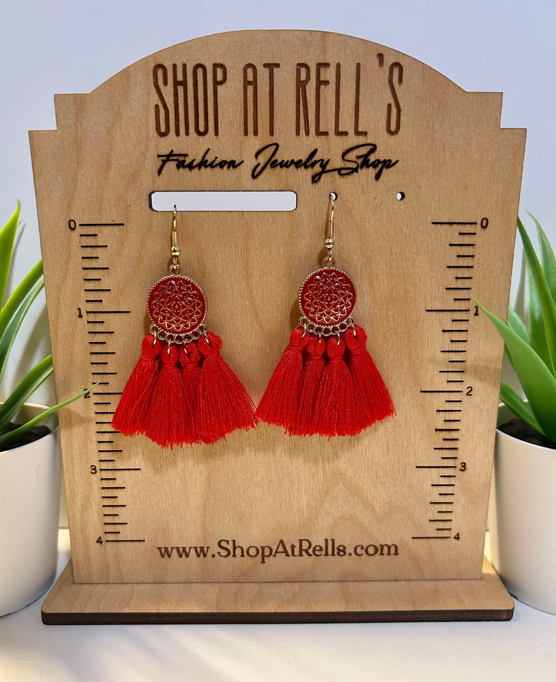 Not Handmade. These are so cute…I just had to have them in my store! Red colored charm with golden trim and matching tassels. About 2.5 inches long.