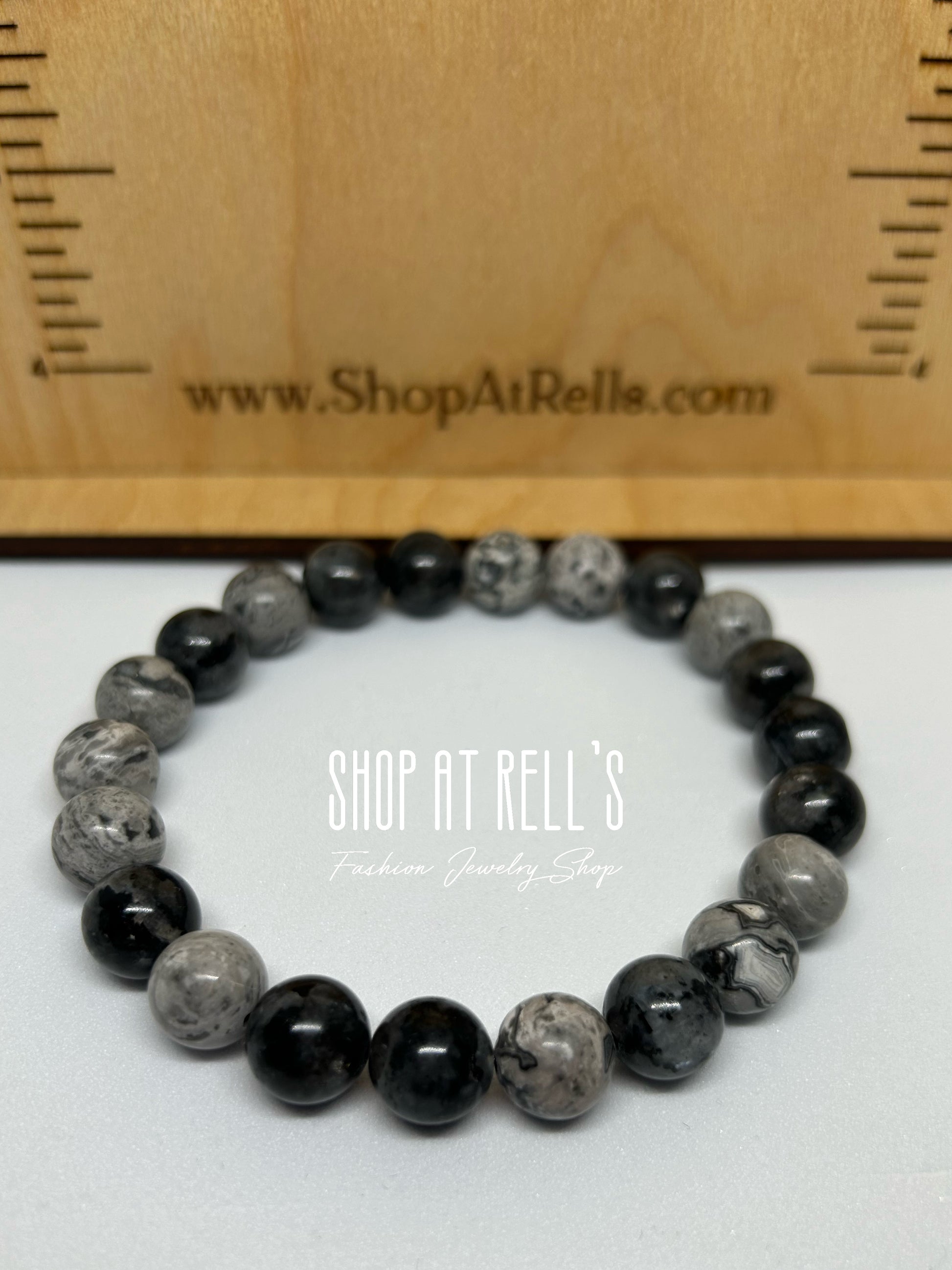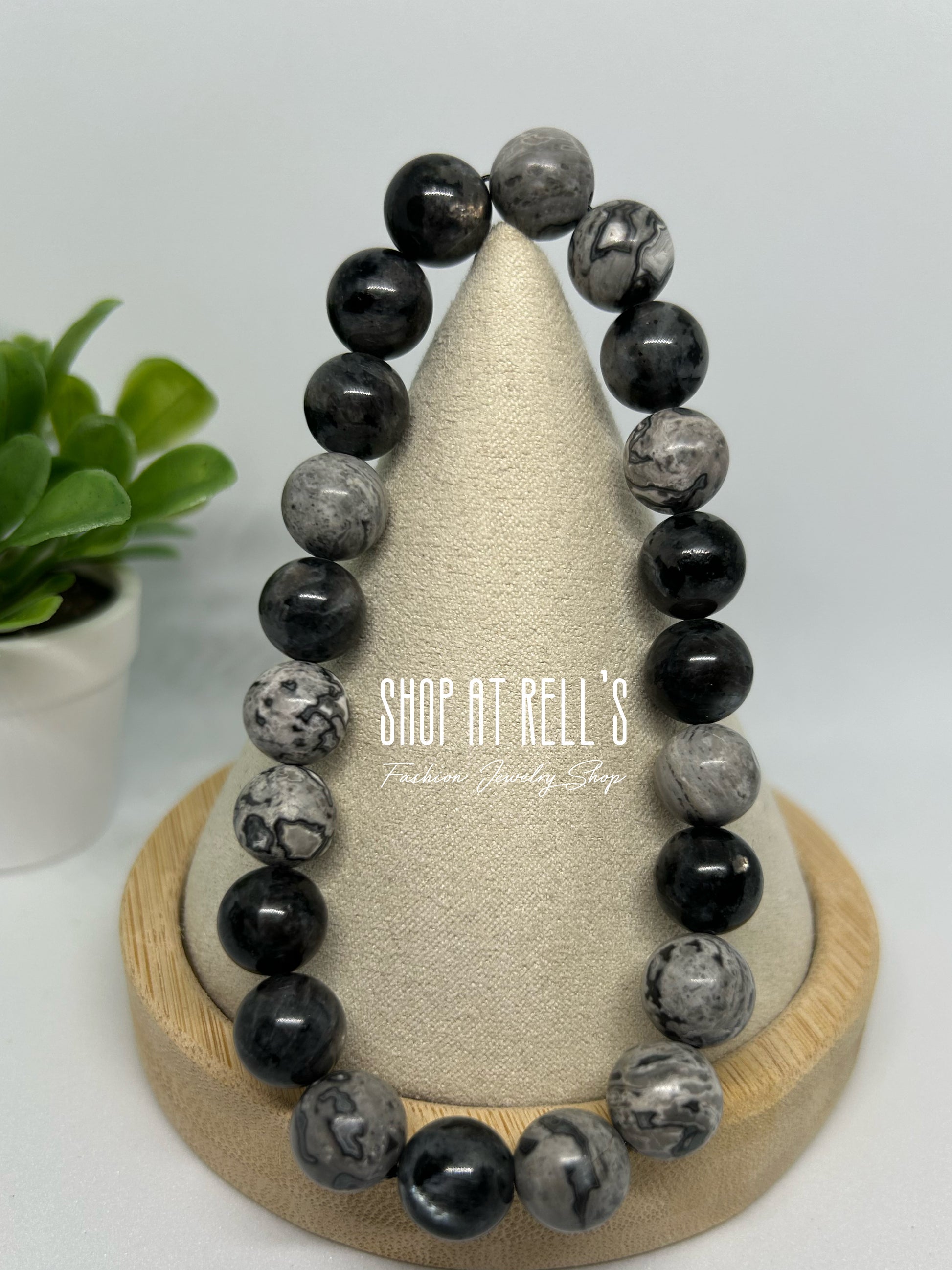 Upgrade your casual look with this unisex stretch bracelet strung with shades of 10mm gray jasper and labradorite beads.