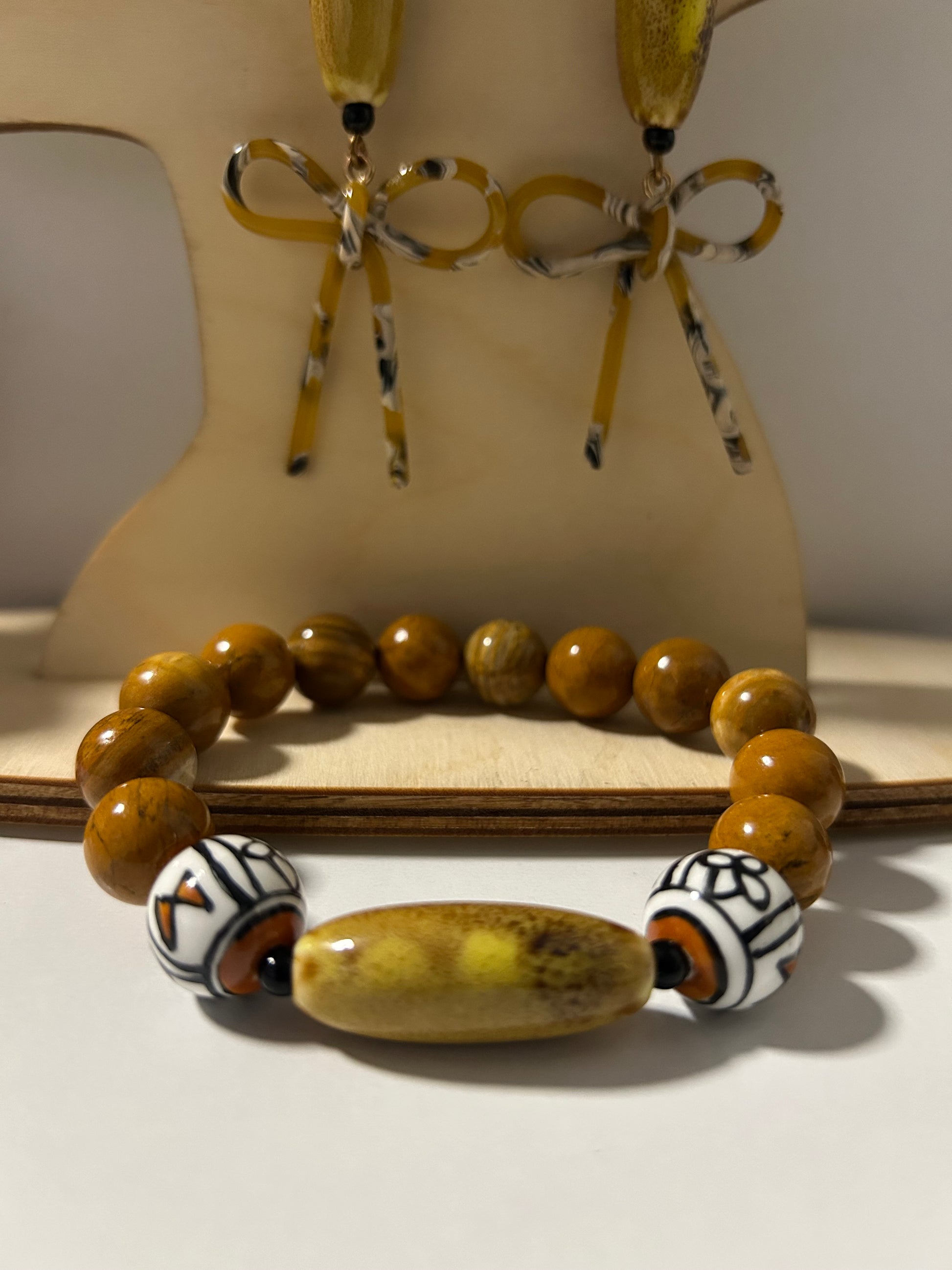 Handmade mustard‑yellow jewelry set with bow earrings and a stone and ceramic beaded bracelet. Earth‑tone boho style, lightweight, unique, and perfect for everyday wear.