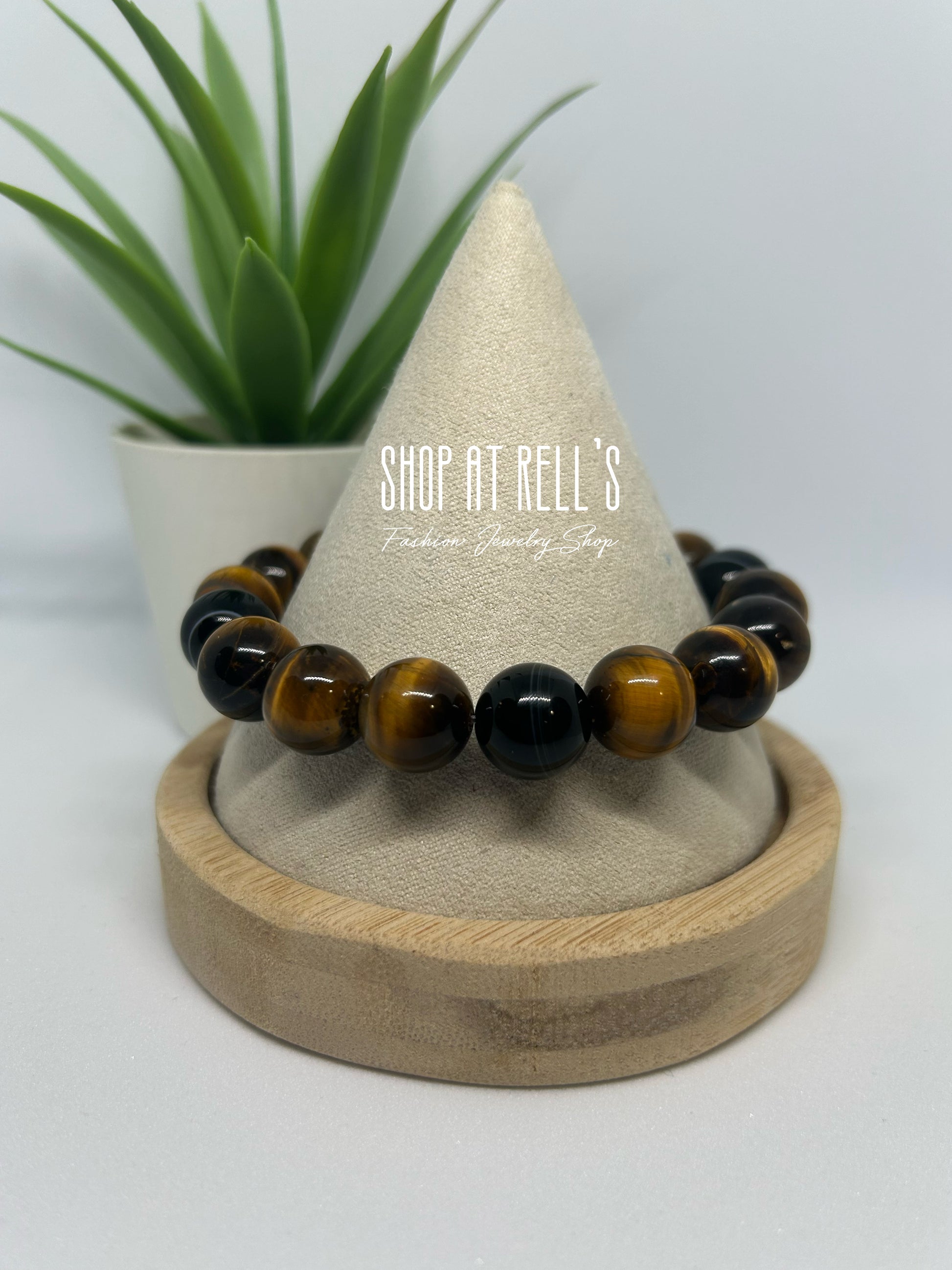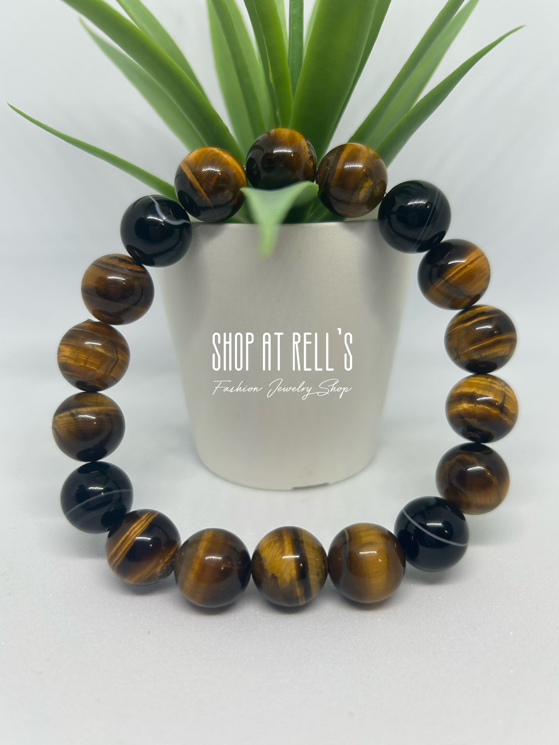 Back in stock! Wrangle in some stylish energy with this 7 or 8 inch stretch bracelet featuring 12mm tiger eye and black agate stone beads. Bring out your inner wild with Tiger Kingdom!